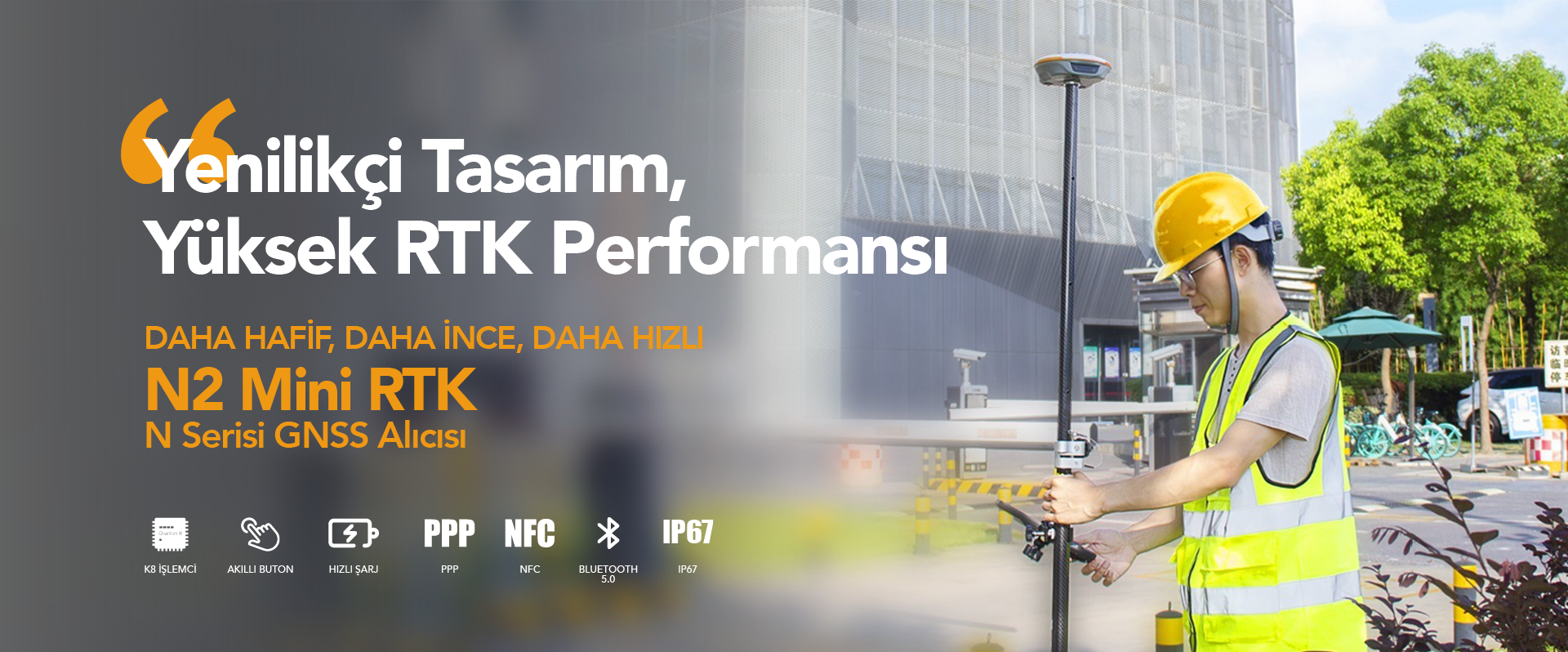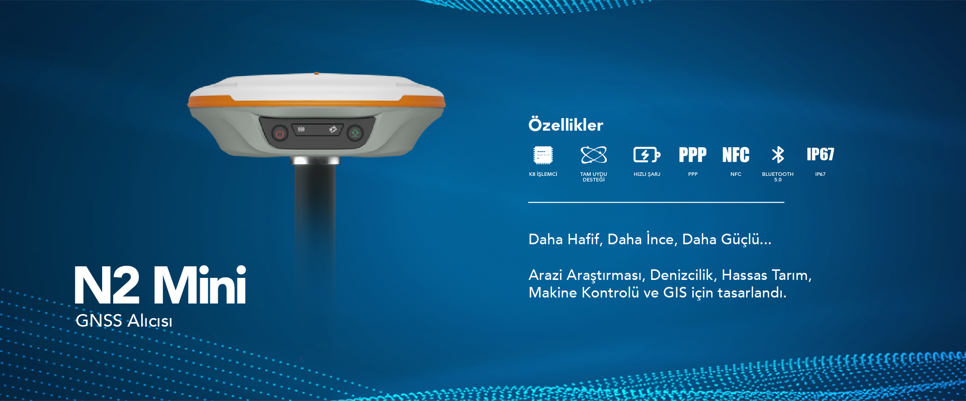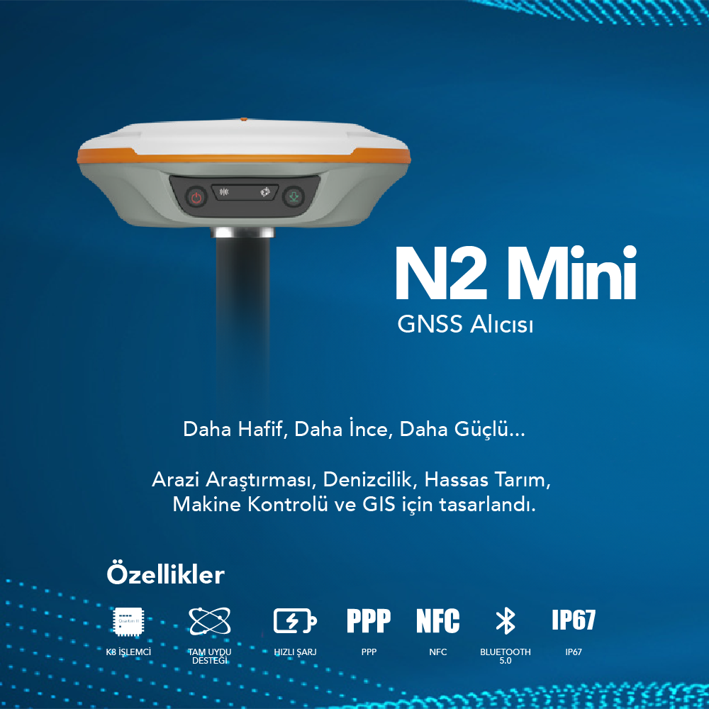 İnce hatlı tasarım, N2'yi en kompakt GNSS alıcılarından biri yapar: yalnızca 48 mm ve pil dahil 0,67 kg, kolay taşınabilir, kullanılabilir ve çalıştırılabilir. Daha Hafif, Daha İnce ve Daha Güçlü - N2 özellikle arazi ölçümleri, denizcilik, hassas tarım, makine kontrolü ve GIS gibi bütün mühendislik işlemleri için tasarlanmıştır.